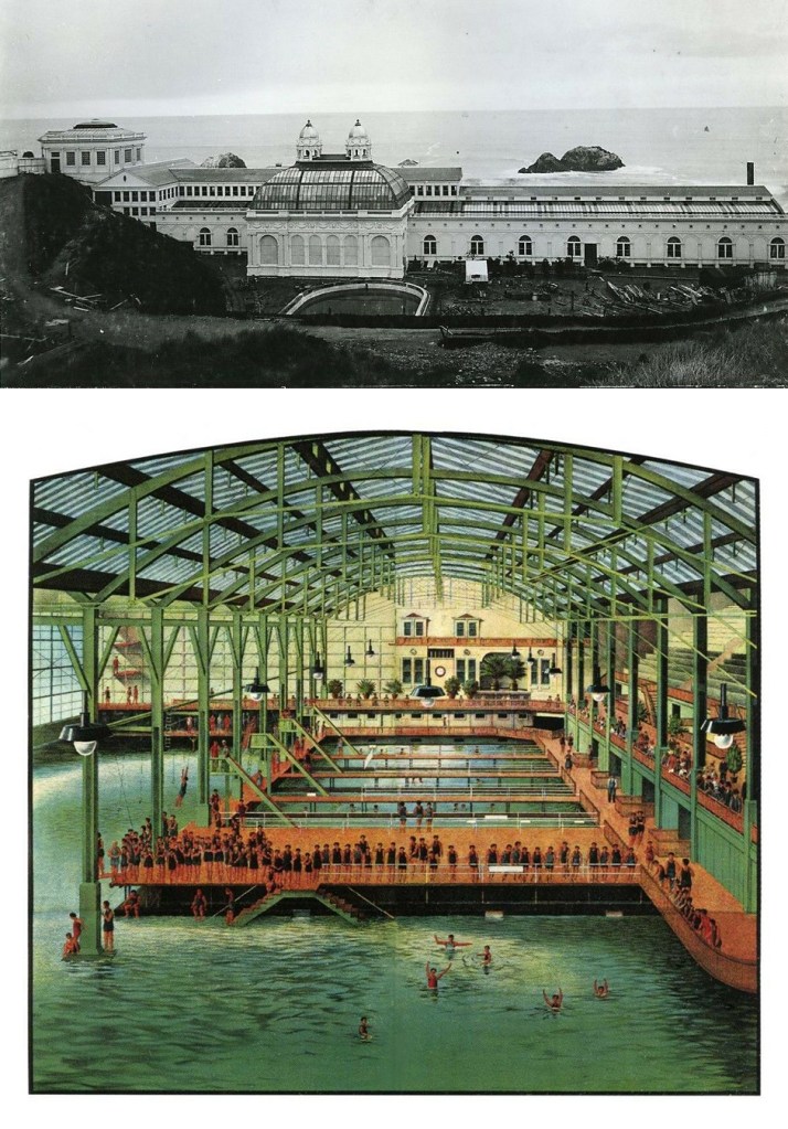 Sutro Baths had only opened some 22 years before. It contained 6 saltwater pools, 1 freshwater pool, 7 water slides, 30 swinging rings, and 1 springboard.1